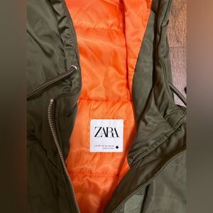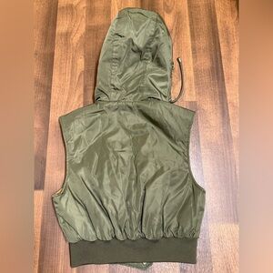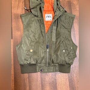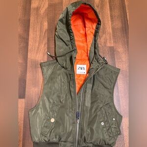 Olive vest with hood. Bright orange interior. Front zipper closure.