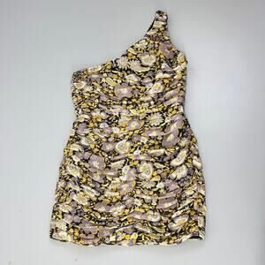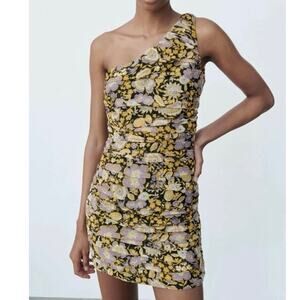 Zara One Shoulder Ruched Bodycon Mini Dress Dark Yellow Floral