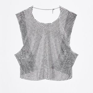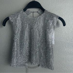 Sleeveless metal top with round neckline. Rhinestone details. Open back. Lobster clasp and chain back closure!
