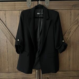 Zara Open Front 3/4 Rolled-Up Sleeves Blazer Black Size Small