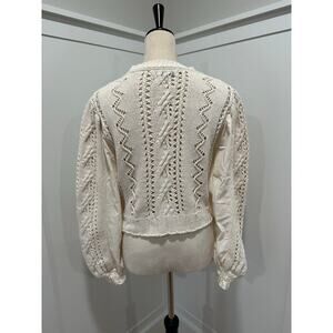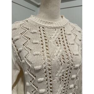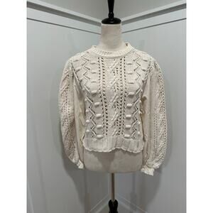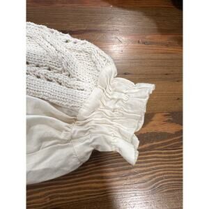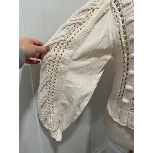 Open knit. Balloon sleeves. Sleeves are a blouse material on the underside. Ruffle detail at cuffs. Sweater portion is 52/48 cotton/poly blend. The under sleeves are 100% cotton.