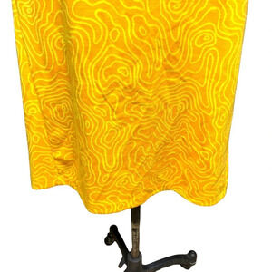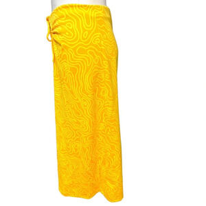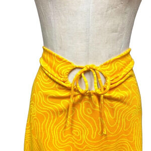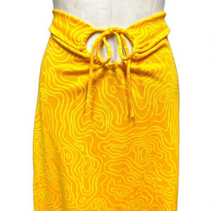 Featuring an abstract topographical print in bold bright orange and yellow. Drawstring cinch waist detail surrounds a cutout section, creating a fun ruched look. High center slit at the rear makes moving in this easy, and gives enough flex to avoid rolling up.