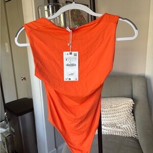 Vibrant orange bodysuit. Sleeveless design. Perfect for layering.