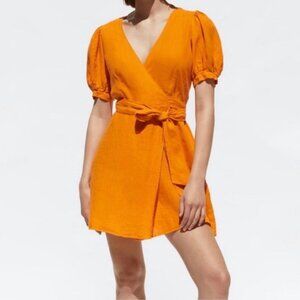 Zara Orange Wrap Dress Linen with Puff Sleeves & Waist Tie