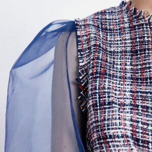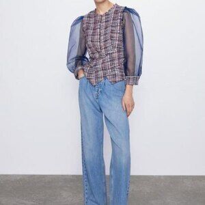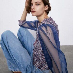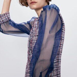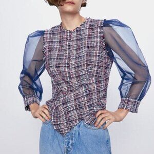 Zara Organza and Tweed Mixed Media Puff Sleeve Blouse Top (NWT)