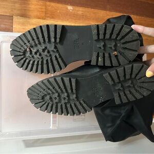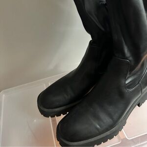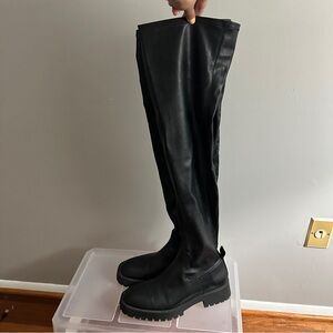 Over the knee boots. Fitted upper. Thick lug soles. Rounded toe.