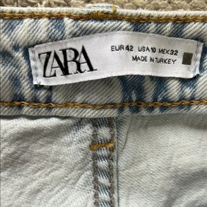 These blue straight leg jeans from Zara showcase a naturally distressed look, highlighted by subtle rips at the knees. Crafted from traditional denim, they offer a relaxed and casual style perfect for everyday wear.