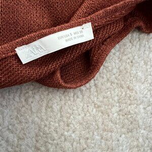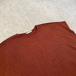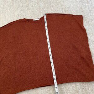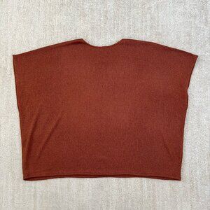 A warm tan / brown lightweight knit top that measures oversized width-wise. Missing care and fabric content tag, fabric feels like it might be a linen blend.