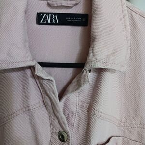 Zara Oversized Light Pink Size Small Denim Shacket. Made from 100% cotton denim, the jacket features a relaxed fit with a button-down lapel collar. Side pockets and one chest pocket. Length 28 in chest 23 in sleeves 21.