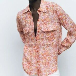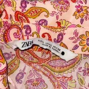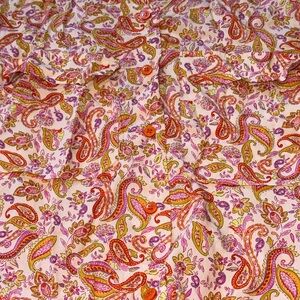 In excellent condition. No issues. Material tag is missing but it feels like a poly blend - not cotton. It’s a slinkier fabric but has structure.
