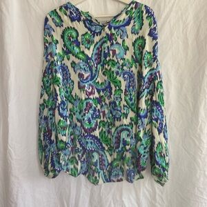 This Zara blouse features a captivating blend of blue and green hues, crafted in a lightweight fabric for a relaxed fit. The long sleeves and rounded neckline enhance its elegant silhouette, making it a versatile addition to any wardrobe.