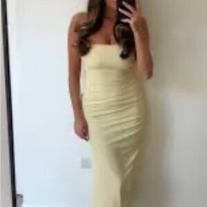 Zara Pale Yellow Ruched Strapless Midi Dress