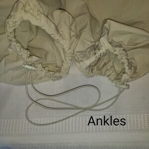 Still has tags, an amazing parachute jumpsuit by Zara. In Ecru( cream) color. Halter style top with plunging neckline. Attached belt at waist. Cargo pocket on each side. Back pockets. Has zipper/ clasp closure in front. Elastic at ankles with drawstrings. Elastic Waist. Utilitarian, yet sexy. Toggle pull behind neckline. Backless.