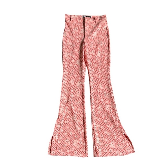 Zara Pastel Red/Coral and Cream Checkered Floral Flare Pants size small