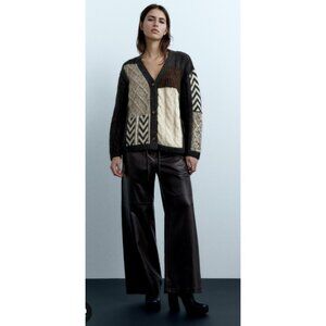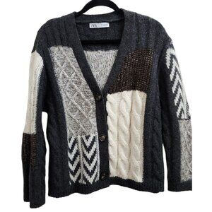 Zara Patchwork Cardigan Sweater Womens Size S Brown Ivory Oversized Chunky