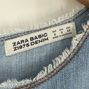 Casual and versatile Zara Basic Z1975 denim dress in a patchwork style. Features a sleeveless shift silhouette, raw frayed edges, exposed zipper closure at the back, and large front patch pockets for a laid-back, utility-inspired look. Perfect for layering with tees, turtlenecks, or wearing on its own with sneakers or sandals. Great pre-owned condition - no flaws.