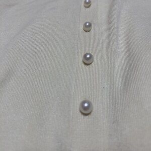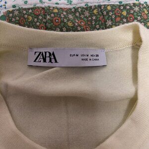 Pearl buttons that don’t actually unbutton. They have a seam that closes it shut but still has the look of a cardigan. Very cute but too small on me (I'm typically a size 8/L in Zara). I cut the tag off but I think this is some polyester blend. Soft/slinky feel.