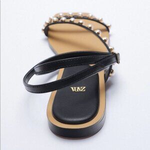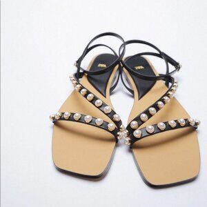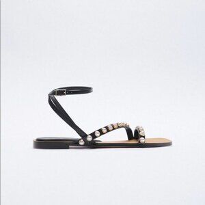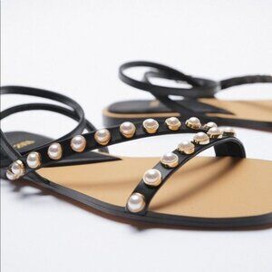 Zara Pearl Embellished Strappy Leather Flat Sandals Ankle Wrap