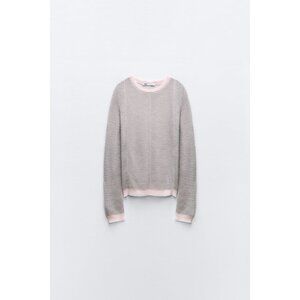 Indulge in luxurious comfort with this Zara alpaca wool blend sweater. The open knit construction ensures breathability while maintaining warmth, making it an ideal choice for versatile styling. Its subtle pearl grey tone, accented with contrast pink, offers a touch of sophistication and modern elegance.