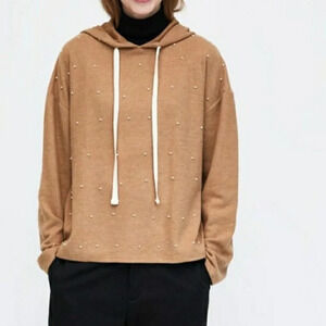 Zara Pearl Sweatshirt Sweater Pullover Hooded Tan Camel Size Small