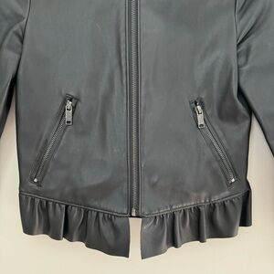 Trendy black faux leather jacket with ruffle/ peplum accents.