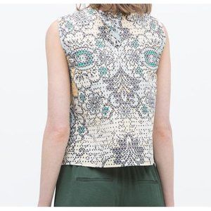 Zara "Perforated Tank," size M. Stunning floral print with all-over laser cut detailing. Buttoned back placket. Sleeveless. Dress up or down! 100% cotton.