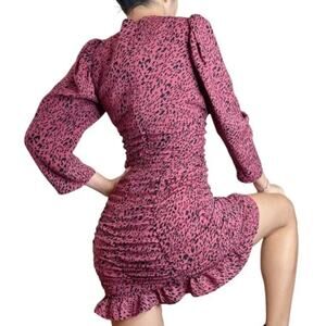 This Zara dress features a bold pink and black leopard print over a stretchy, ruched bodycon silhouette. Designed with a square neckline, long puffed sleeves, and gathered texture throughout, it hugs the body while adding dramatic volume at the arms. Pair with a sleek heel or layered jewelry for a standout night-out look.