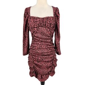 zara leopard print dress, ruched bodycon dress, pink animal print outfit, size medium, puff sleeve party dress, square neckline dress, stretchy fitted silhouette, bold night out look, statement sleeve styling, trendy fall outfit, milkmaid, club, dancing, gift