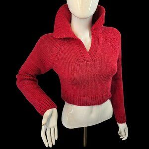 Zara Pink Cropped Cable Knit Sweater V Neck Collared Long Slv Womens XS Pink NEW