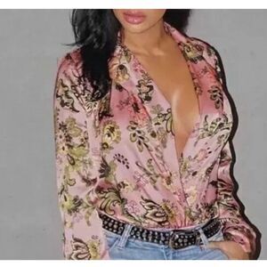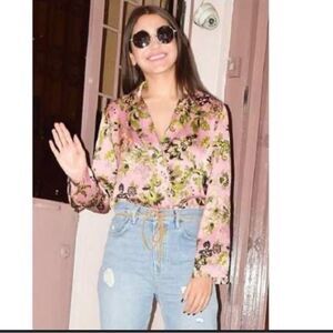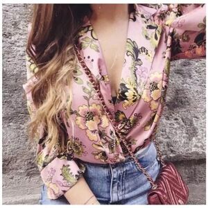 Zara Pink Floral Satin Long Sleeve Blouse size small