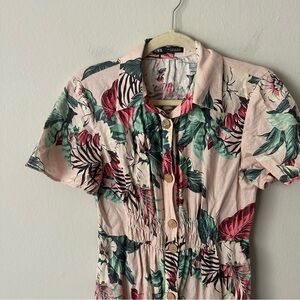 Zara Pink Green Tropical Leaf Floral Print Linen Midi Summer Dress size M