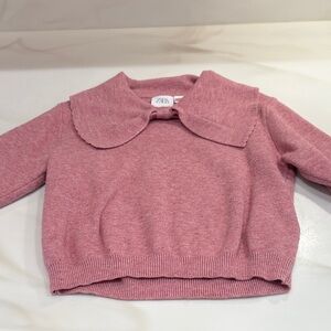 Cozy pink sweater with a scalloped collar. Long sleeves. Soft knit fabric.