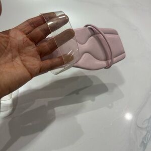 These Zara sandals feature a sleek square-toe design in a soft pink hue, perfect for adding a touch of elegance to any outfit. The minimalist style is highlighted by a thin strap with a subtle twist detail, offering a modern and versatile look. Ideal for both casual and dressy occasions, these sandals provide comfort with their flat sole and smooth finish.