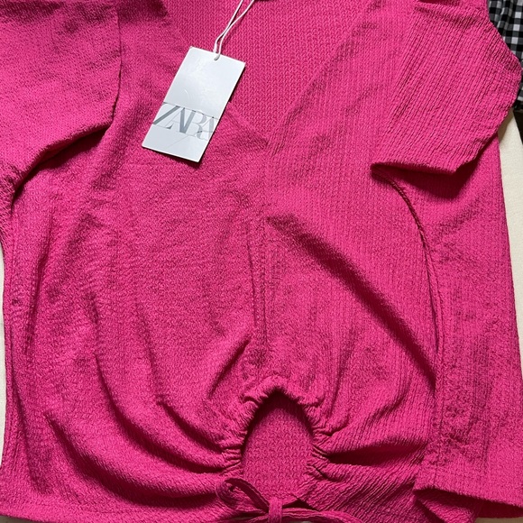 This stylish pink blouse from Zara features a ribbed texture and a ruched design with a charming tie front. The short sleeves add a touch of elegance, making it a versatile piece for any occasion. Crafted with attention to detail, this blouse is a must-have addition to your wardrobe.