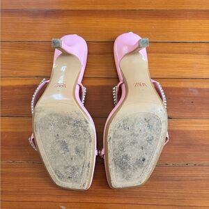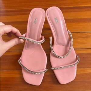 Chic pink sandals by Zara. Adorned with sparkling rhinestone straps. Ideal for adding elegance to any look.