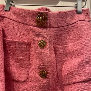 Stylish pink cropped blazer with matching skirt. Features large buttons and front pockets.