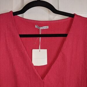 Zara Pink Textured V Neck Cut Out Keyhole Drawstring Front Detail Short Sleeve Blouse Crop Top M. EUC. No tears or holes, but does have one light stain on front right sleeve. It might have been when I was steaming this top, but I wanted to disclose that (pic 8 & 9). Only noticeable with flash on. Stretchy almost waffle-like material. Key hole detail with ties on the front bottom of blouse. Short wide sleeves. 99% Polyester 1% Elastane.