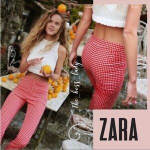 Zara Pink White Gingham Checkered High waist Flare Pants Slacks XS
