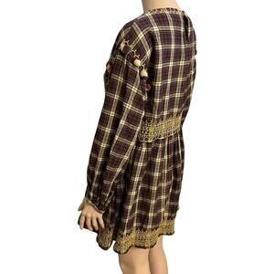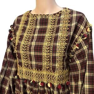 Zara Plaid Mini Dress Small Pom Pom Embroidered Flowy Loose Fit Balloon Sleeve