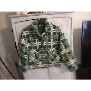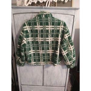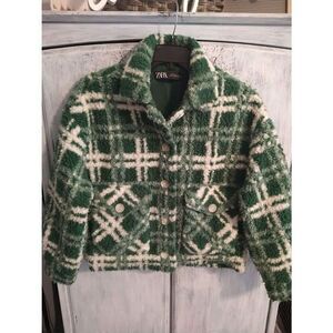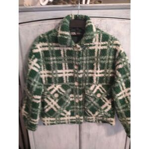 This Zara jacket in size medium features a trendy plaid pattern in green and white. The oversized fit is perfect for layering, and the short length makes it suitable for both casual and formal occasions. The jacket has a collared neckline and 4 front buttons for closure, with long sleeves and 1-button cuffs for added style. The jacket is made of polyester shearling sherpa fleece, making it warm and cozy for the fall and winter seasons. It also features 2 large front-buttoned pockets for convenience. Machine washable for easy care, this jacket is a must-have for any modern wardrobe.