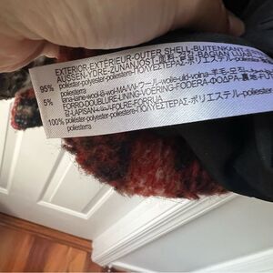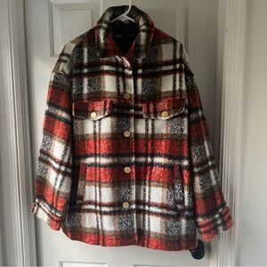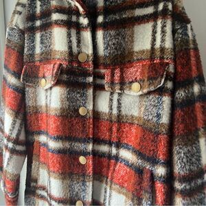 Burgundy, tan, black and white plaid button down oversized boxy shacket jacket. Two front flap chest pockets and two regular pockets. Rounded hem. Thick, heavy and warm. (Slightly different plaid pattern than in model photo, included model photo to show fit). In great condition with minor wear and fuzziness on wool