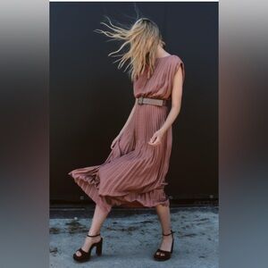 Elegant pleated midi dress. Features a belted waist. Sleeveless design. Perfect for any occasion.