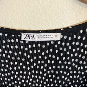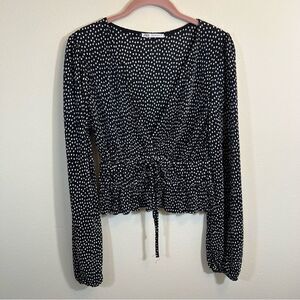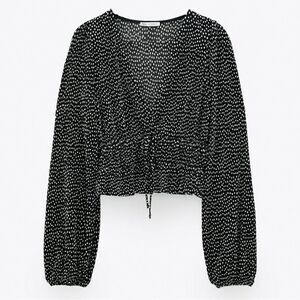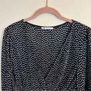 Zara women’s black and white polka dot crinkle V-neck long sleeve top. Ties at waist.