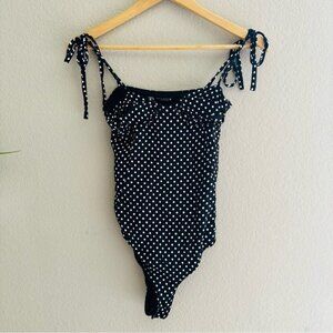 Stylish black one-piece swimsuit with white polka dots. Features adjustable shoulder ties.