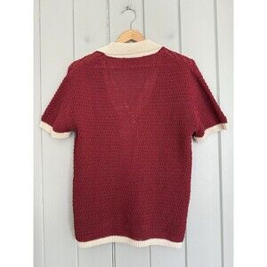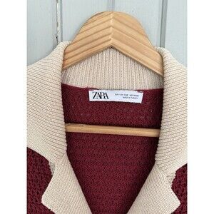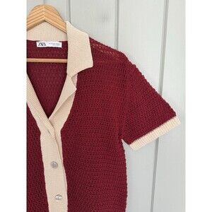 Zara Polo Cardigan Sweater S/M Burgundy Red Collar Button Front Crochet