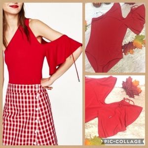 Red one shoulder off shoulder bodysuit. Has drawstring in the Bell off shoulder sleeve. Snaps in the crotch. New with tags.