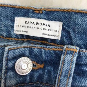 Zara Woman Premium Denim Collection Mid Rise Blue Lightly Distressed Straight Leg Jeans