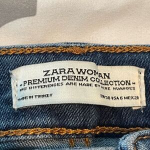 Zara Premium Denim Collection Mid-Rise Skinny Jeans in Medium Distressed Wash Denim. They are a Mid-Rise Classic 5 Pocket styling with stretch pant with a Raw Hem. It is great for casual days at work, school, date night, night out with the girls, and Family Dinner. It would make a great Christmas Hanukkah Valentine’s Day Birthday or any Holiday gift!