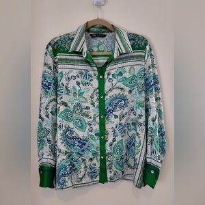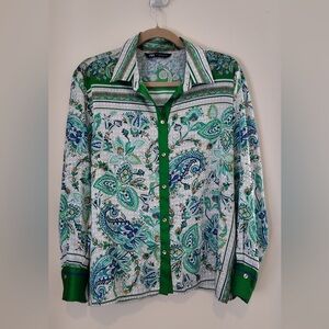 Make a bold statement with this Zara printed button-down shirt in a rich green tone with a designer-inspired pattern. Crafted in Morocco and made with attention to detail, this shirt in Size XL offers a relaxed fit that’s both stylish and breathable—perfect for dressing up jeans or layering over basics.