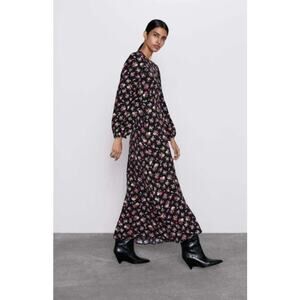 Zara Printed Long Sleeve Black Florals Midi Dress Size Small